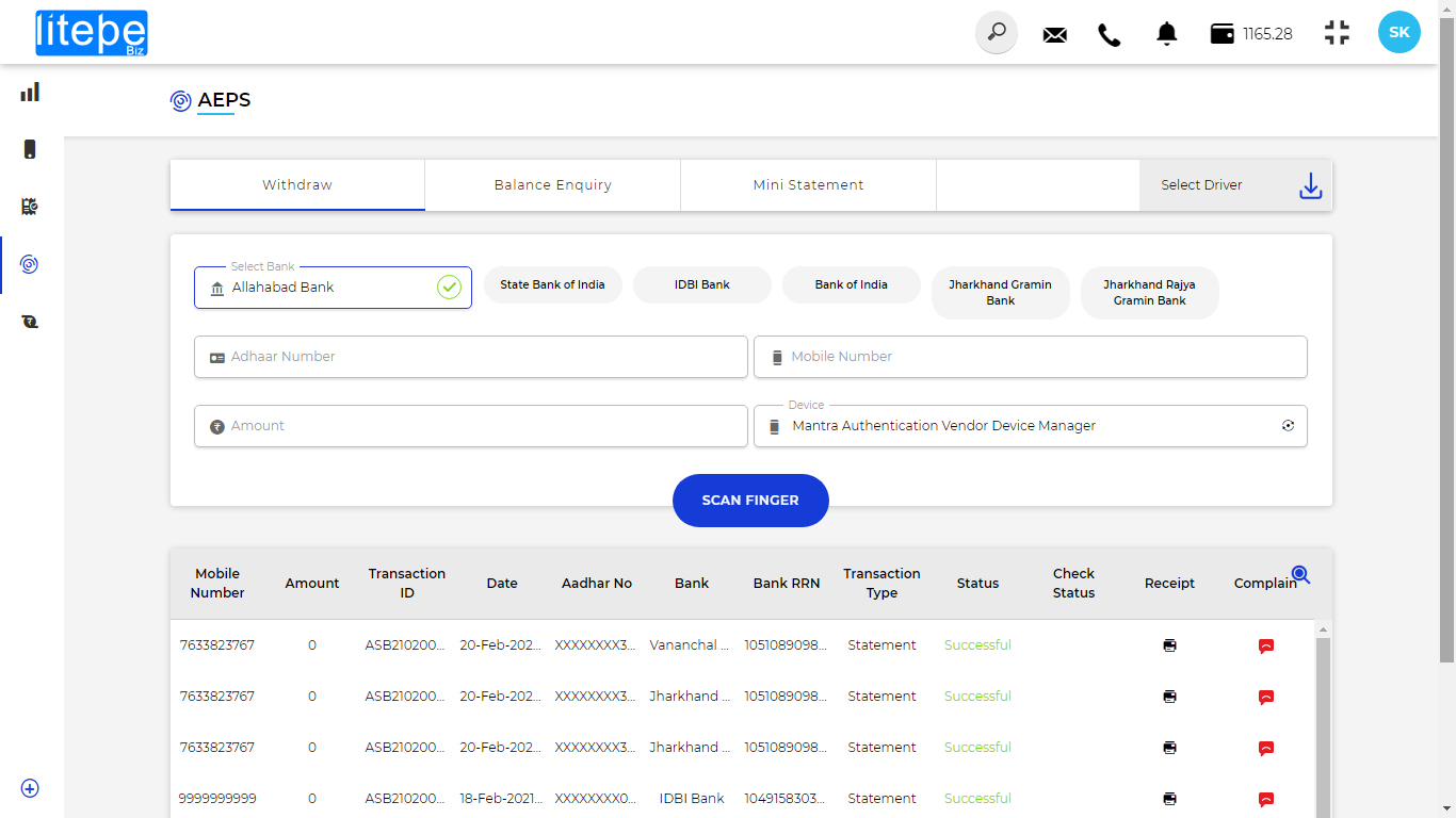 Litepe AEPS service enables our customers for hassel free, secure and biometric authenticated cash withdraw balance enquiry and mini statement from their aadhaar linked bank accounts.